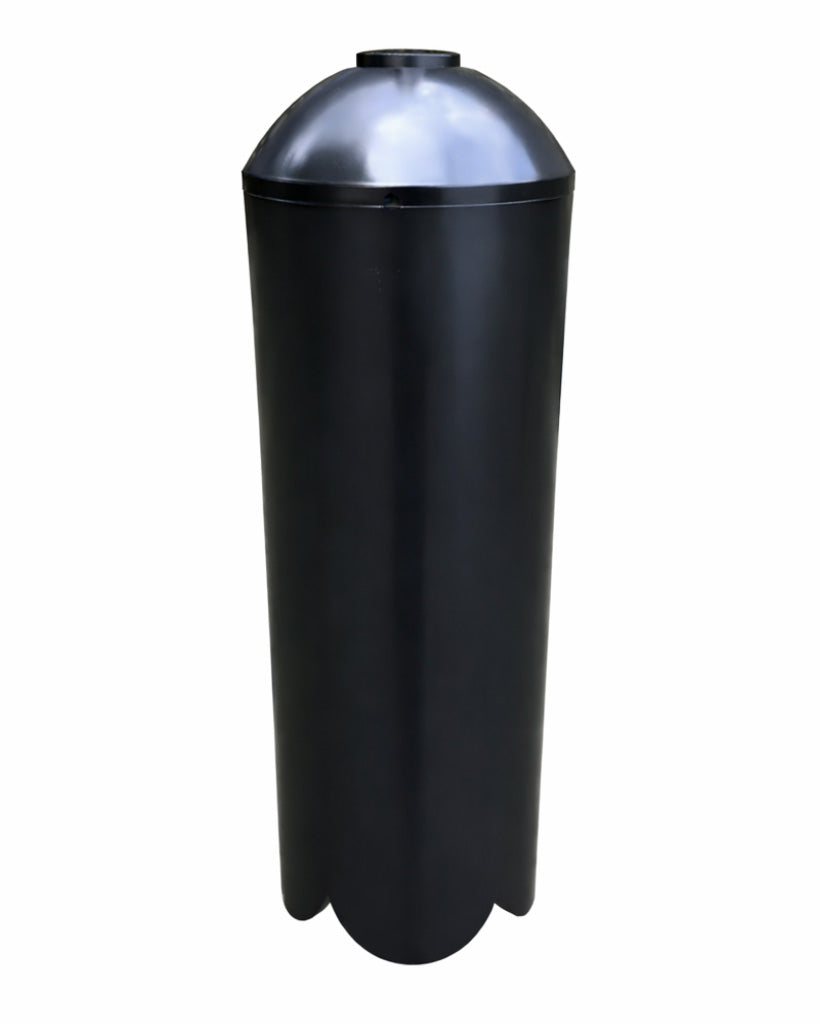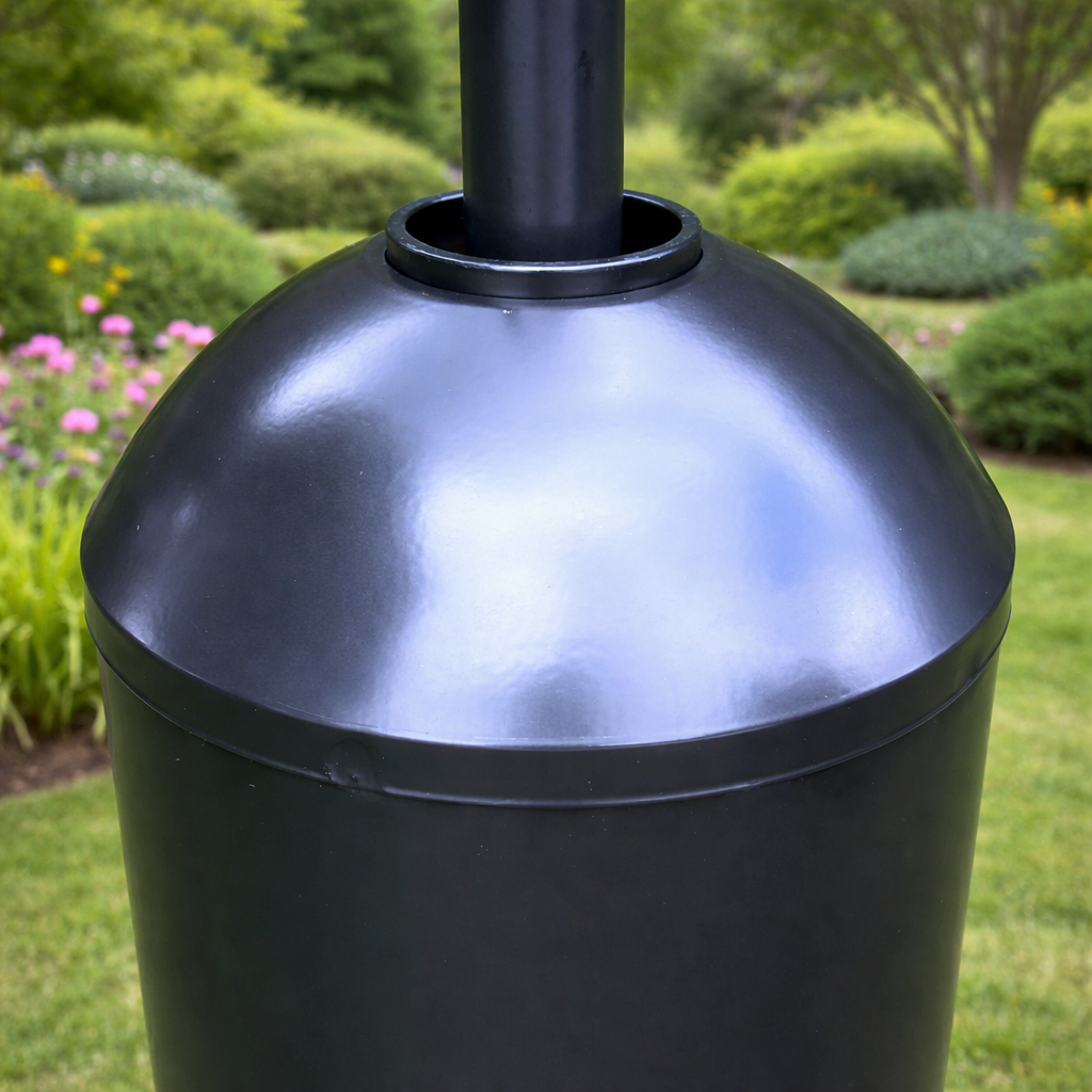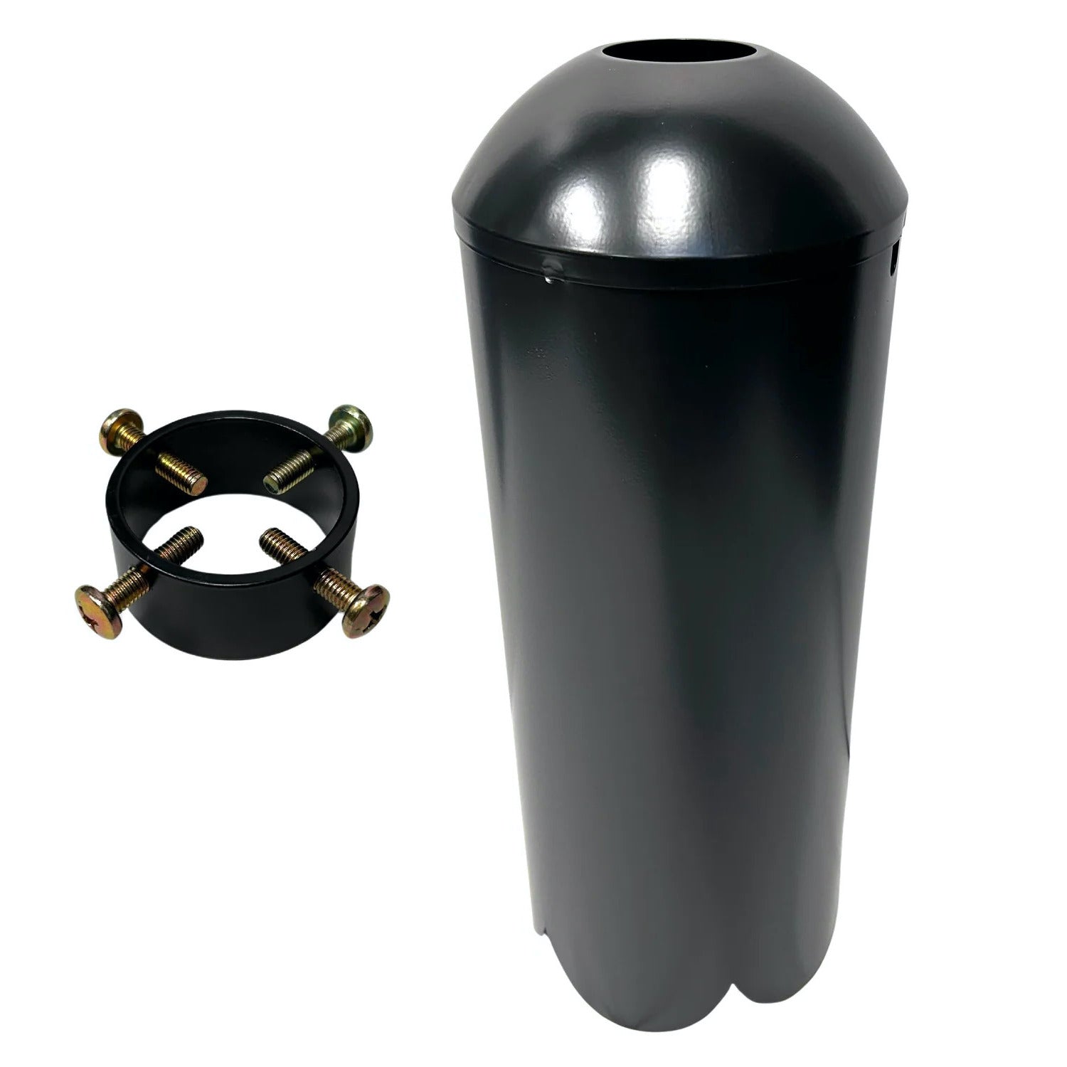 Unlike baffles with a flat top, this design features a curved dome. Flat tops give squirrels a place to land. The curved top causes them to slide off when they try to jump down from above.
